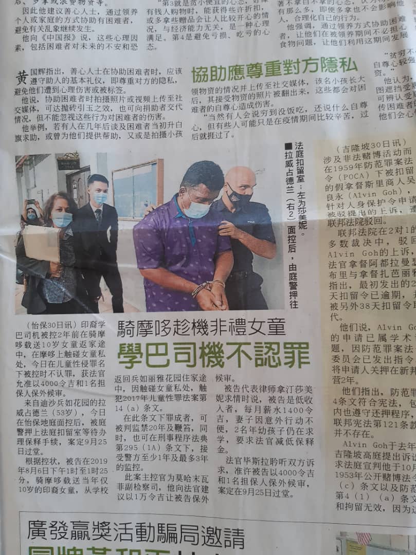 Seorang pemandu bas sekolah mengaku tidak bersalah di Mahkamah Sesyen Ipoh pada jumaat atas tuduhan melakukan amang seksual fizikal terhadap seorang murid di atas motosikal, dua tahun lalu.